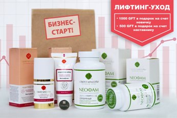 В рамках Акции «Бизнес-старт» мы настоятельно рекомендуем вам приобрести уникальные наборы косметических средств по специальной цене. И это еще не все! При покупке любого из двух ниже представленных наборов, все новые партнеры Компании получат особые привилегии, а именно: годовое обслуживание, регистрационный набор и фирменный корпоративный значок БЕСПЛАТНО, а так же 1000 GFT на свой подарочный счет. Наставник новичка так же получает от Компании дополнительное вознаграждение в виде 500 GFT на свой подарочный счет. Начисления GFT будут сделаны Компанией до 06.09.2017! Все наборы идут в крафт пакете с наклейкой.